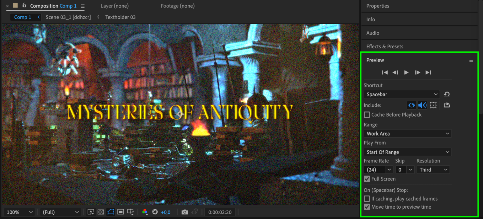 Once you’ve applied and adjusted your effects or presets, make sure to preview your work to see how everything flows together. Use the “Preview” function in After Effects to check for any needed refinements. Pay attention to the timing, transitions, and overall visual impact. Adjust as necessary to make sure your project looks polished and professional.