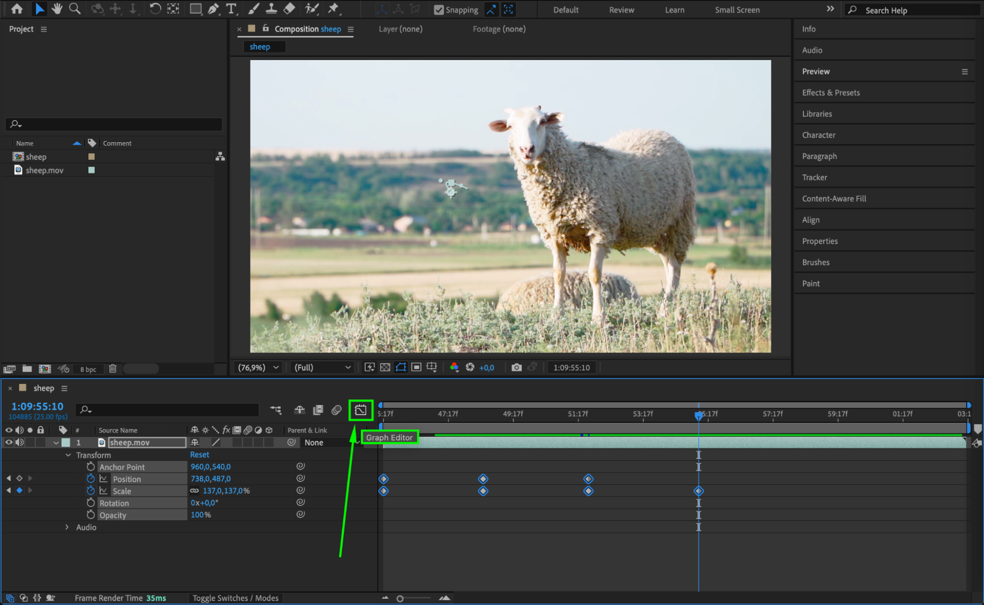 First, create an animation by adding keyframes to a layer’s position, scale, rotation, or any other animatable property. Once you have at least two keyframes, select the property in the Timeline panel and click the Graph Editor button (located in the Timeline). This will switch the display from the standard timeline view to the Graph Editor.