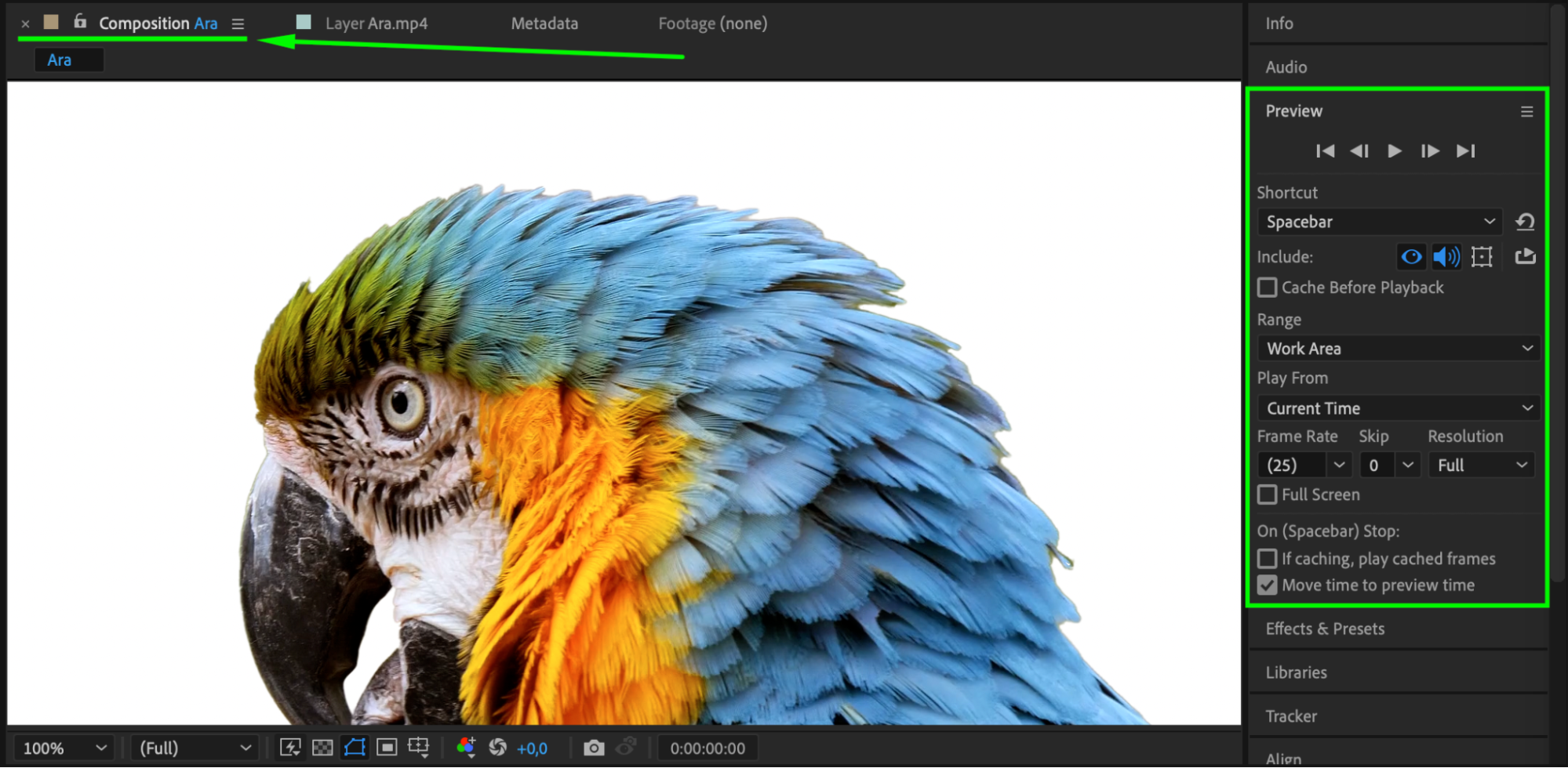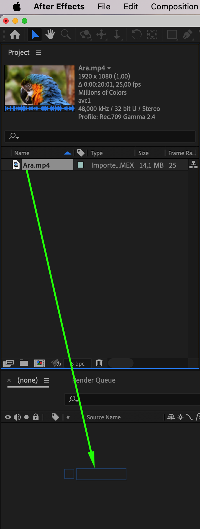 Before you do anything else, import your footage into After Effects and drag the file onto the timeline panel. Make sure it’s clean and high-quality, with a clear subject and distinct background for better results.