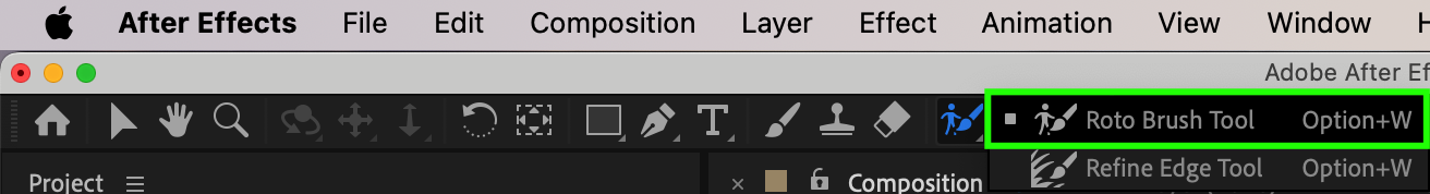 Select the layer to which you want to apply the Roto Brush and navigate to the toolbar. Locate the Roto Brush tool or use the shortcut “Alt/Option + W”.
