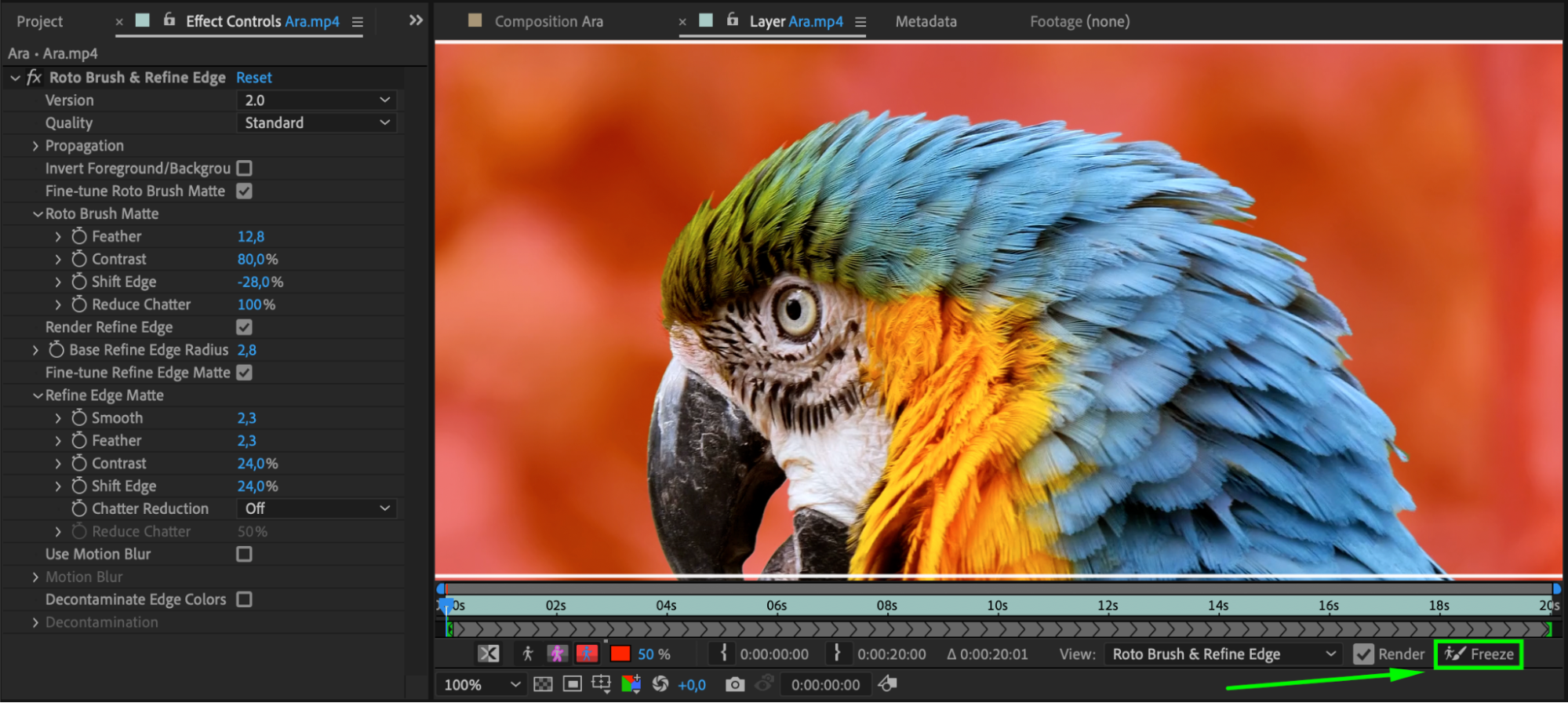 Once you’ve refined the initial Roto Brush selection, you can further enhance the mask using the Effect Controls panel. Utilize parameters such as feather, contrast, shift edge, and reduce chatter to achieve the desired mask appearance. After refining the mask edges, click on the “Freeze” button to lock in the mask and prevent further adjustments.