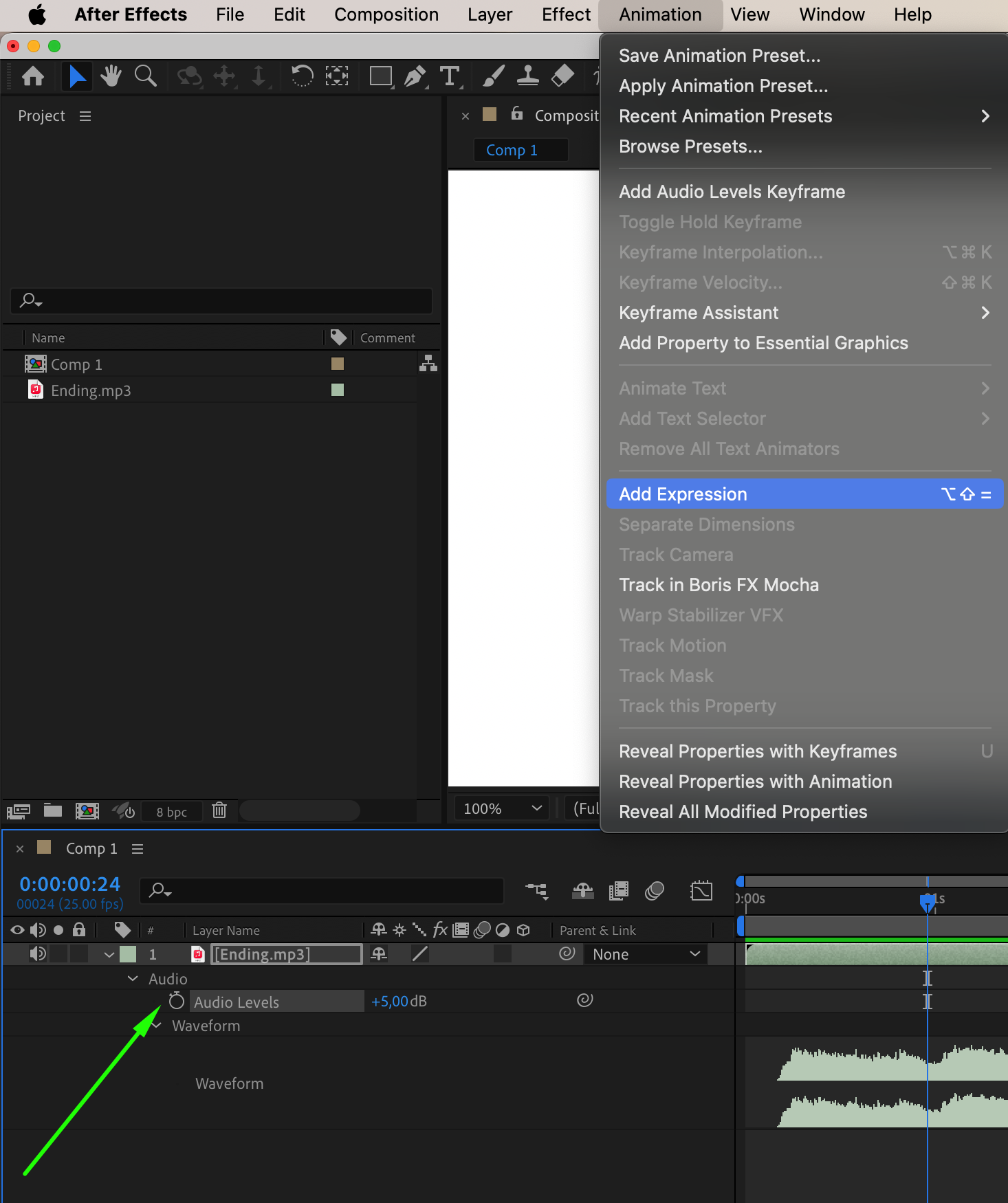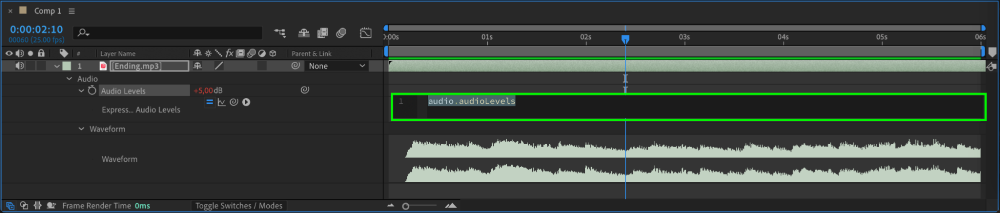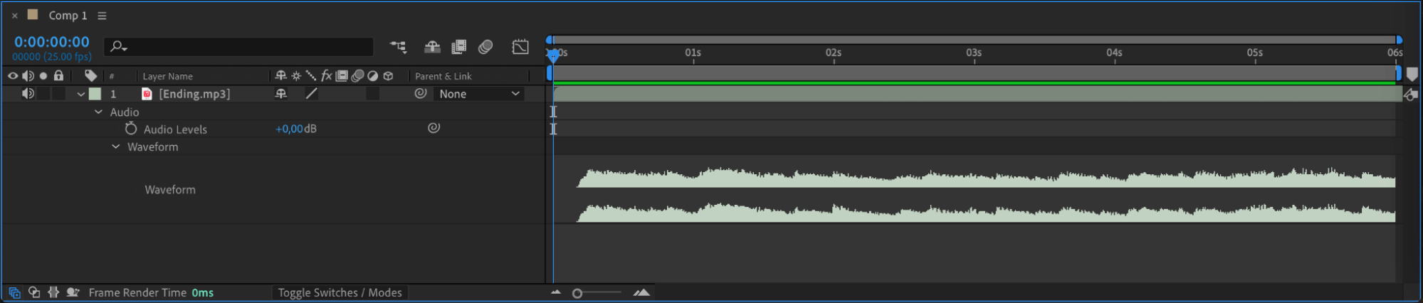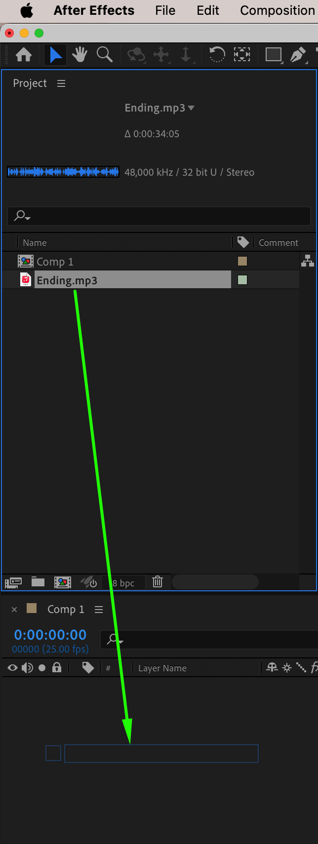 Import your audio file into After Effects and drag it onto the timeline panel to begin working with it.
