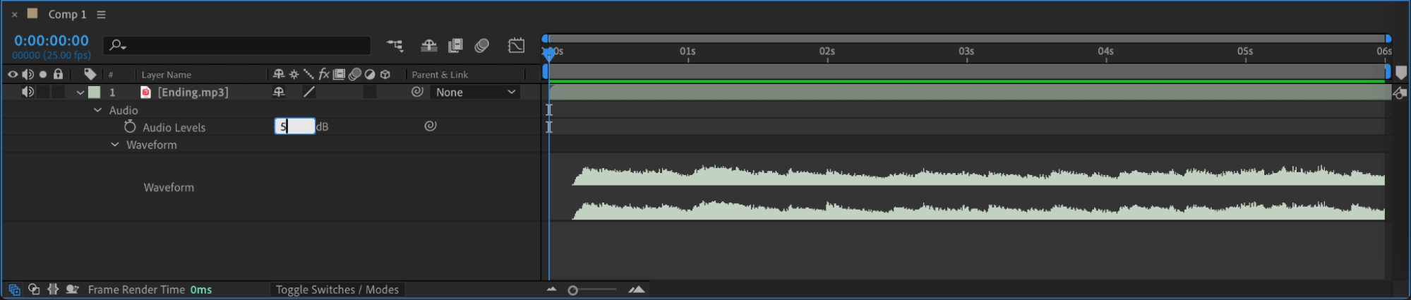 Expand your audio layer properties and adjust the “Audio Levels” parameter to set the volume levels. This is crucial for balancing audio in your project.