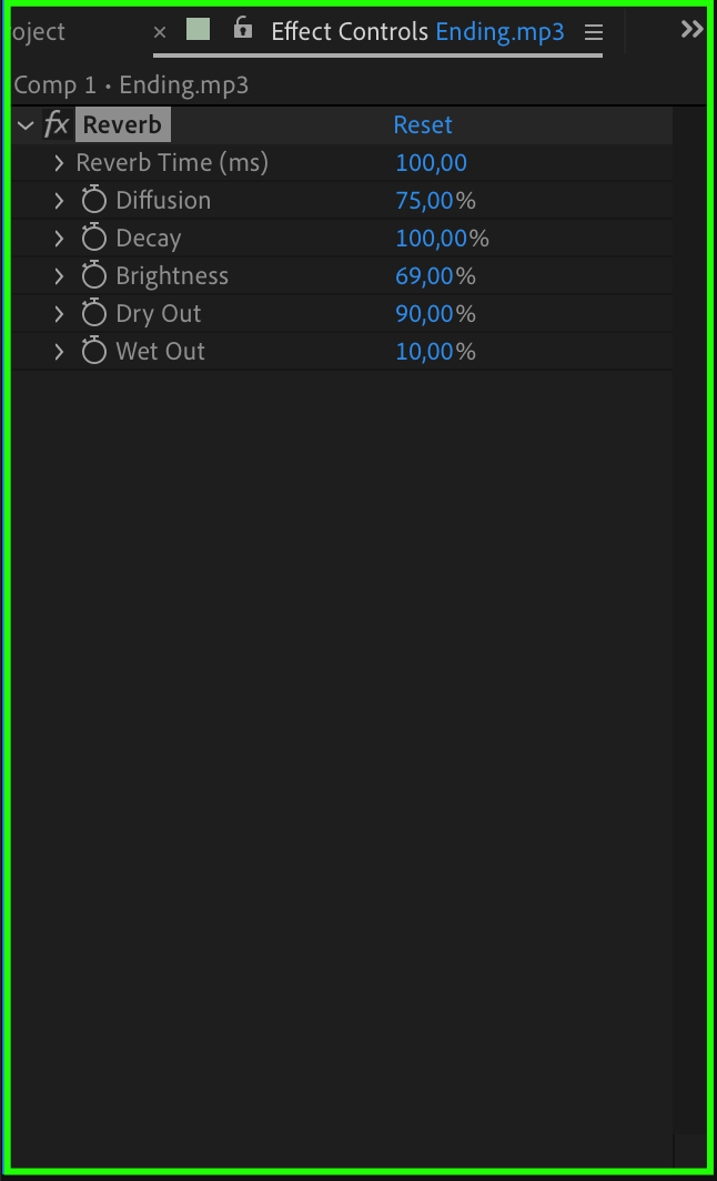 Enhance your audio layer with effects such as reverb, delay, and EQ using the Effects & Presets panel. Adjust settings using the Effects Controls panel to fine-tune audio effects.