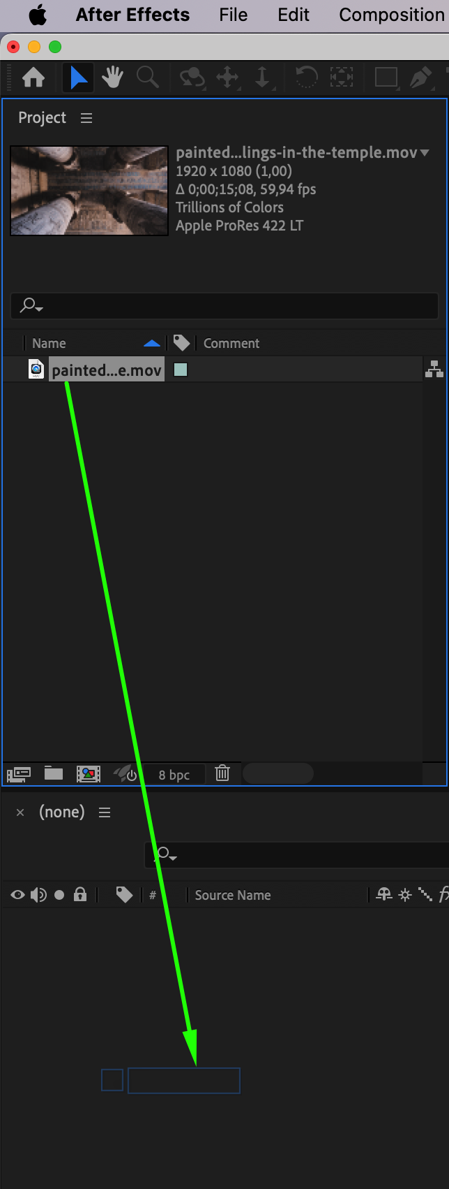 Go to File > Import > File and bring your video file into the project. Drag your footage onto the timeline to create a new composition if needed.