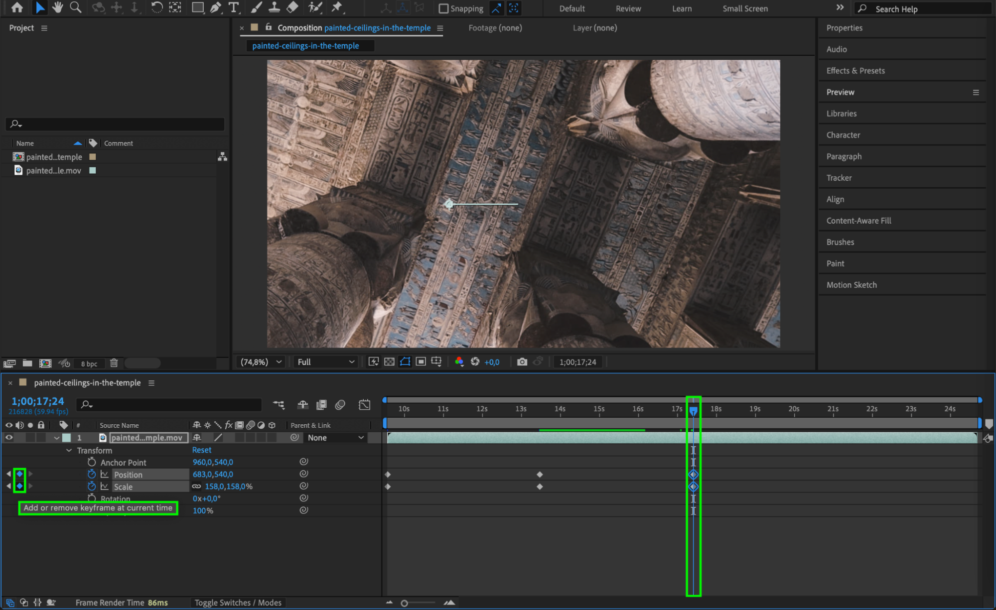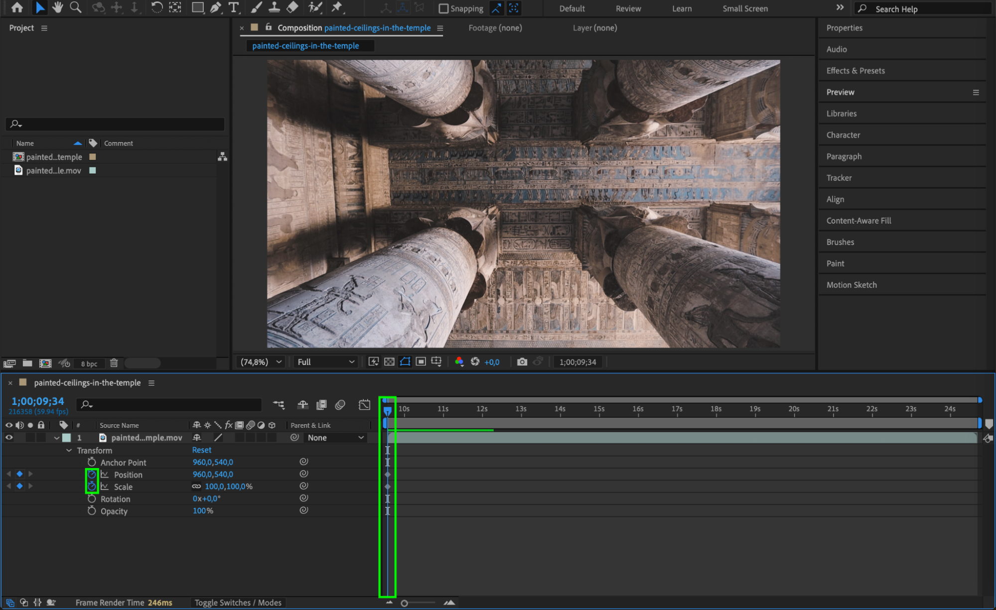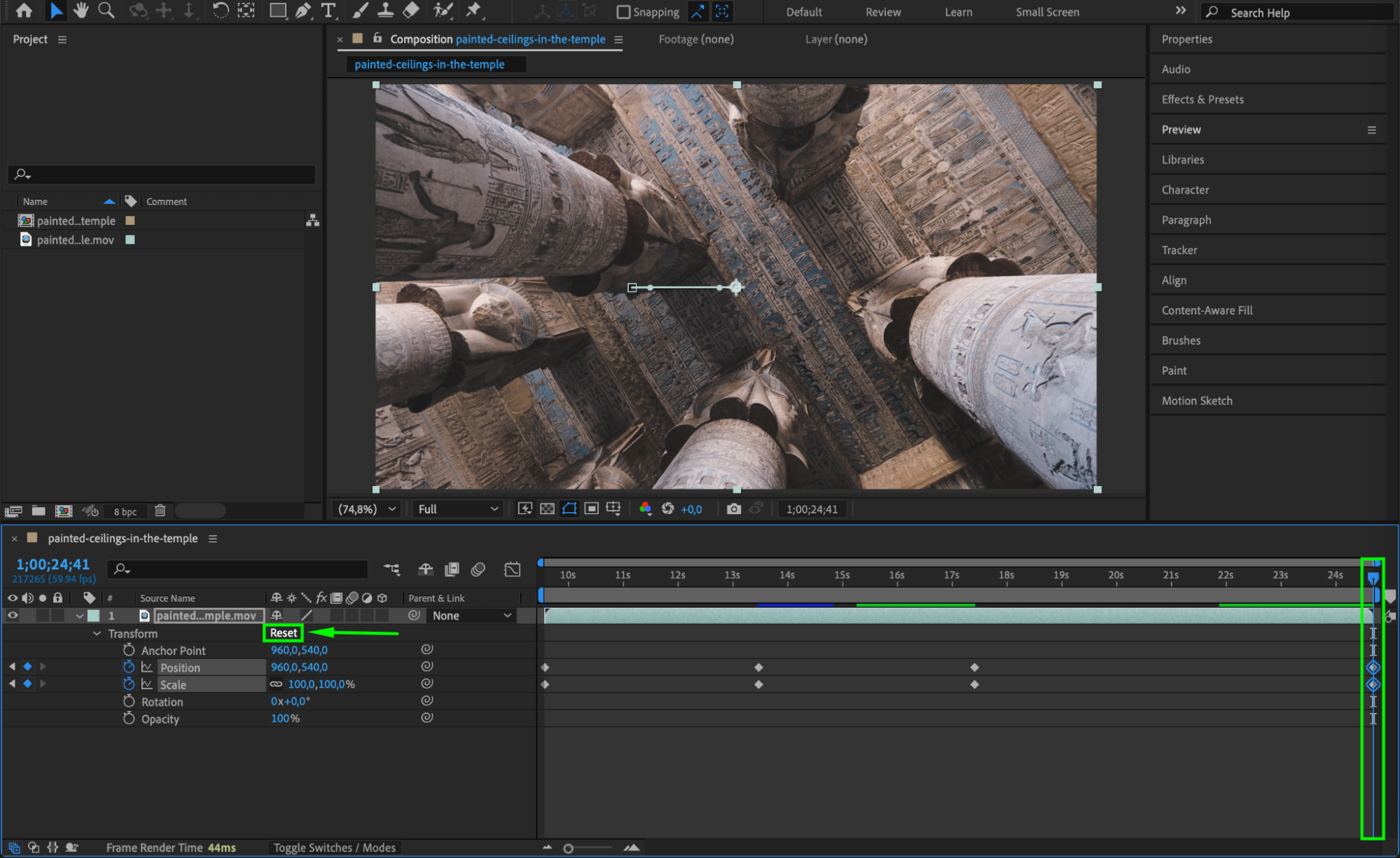 To zoom out, first click the diamond-shaped keyframe button next to Scale where you want the zoom out to start. Move the CTI further ahead toward the end of the composition, then click Reset next to the Transform section to return the Scale (and Position if animated) to their original values.