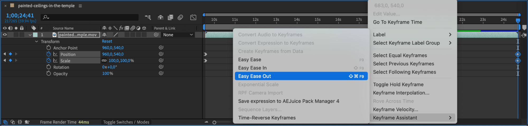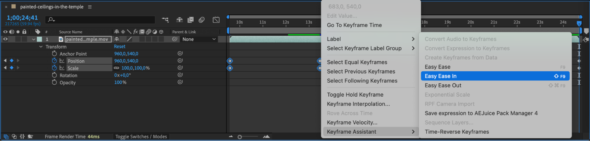 Select the zoom-out keyframes (the second set), right-click, and choose Keyframe Assistant > Easy Ease Out. This will make the zoom-out movement end smoothly.