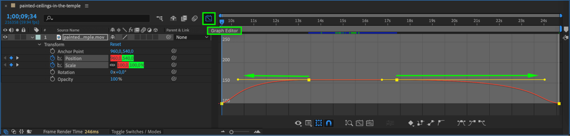 Click on the Graph Editor button at the top of the timeline panel. Adjust the speed graph handles to create a more professional and fluid motion. For example, you can make the zoom start slowly, speed up, then slow down again.