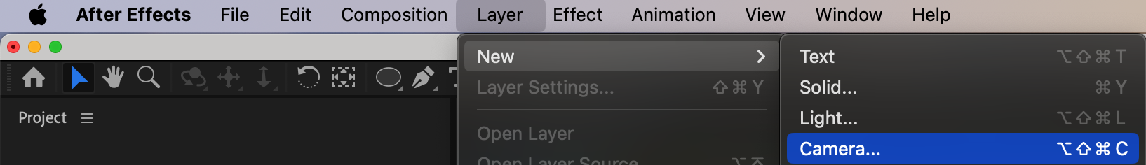 To begin working with a camera, go to the Layer menu at the top and select New > Camera. In the Camera Settings window, choose a camera preset or adjust the focal length and other settings to suit your project. Click OK to create the camera.