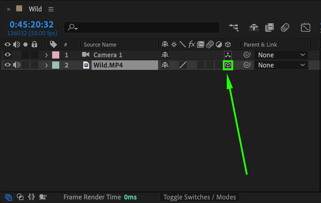 In order to use the camera’s zoom function, your layers must be 3D. In the Timeline panel, click the 3D Layer switch (a small cube icon) next to the layers you want to apply the camera effect to. This allows the layers to be manipulated in 3D space.